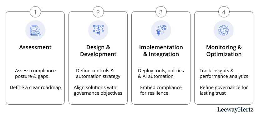 LeewayHertz delivers its Data Security and Compliance Services through a structured, outcome-driven framework that integrates strategy, automation, and intelligence to ensure measurable impact.